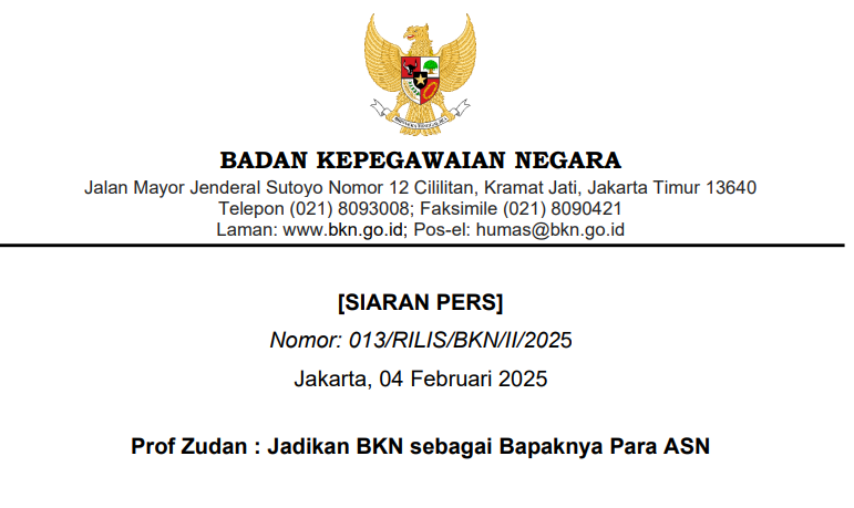 Jakarta - Kepala Badan Kepegawaian Negara (BKN), Prof. Zudan Arif, menegaskan bahwa BKN harus mampu menjadi "bapaknya" bagi para Aparatur Sipil Negara (ASN). Pernyataan ini disampaikan dalam Apel Pagi di lingkungan BKN pada Senin (3/02/2025) secara daring.