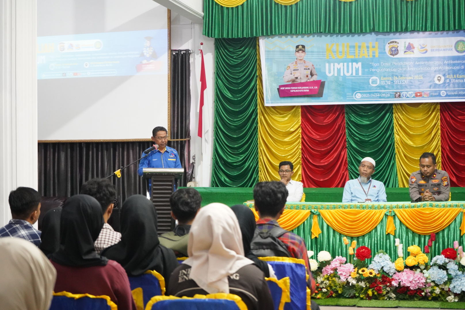 Dumai, 26-02-2026. - ITB Riau Pesisir kembali menegaskan komitmennya dalam membangun budaya akademik yang bersih dan berintegritas melalui Kuliah Umum bertema “Tiga Dosa Pendidikan: Antiintoleransi, Antikekerasan Seksual, Anti Perundungan, serta Penguatan Gerakan Antinarkoba dan Antikorupsi di Lingkungan Perguruan Tinggi” yang digelar Kamis (26/2/2026) di Aula Kampus ITB Riau Pesisir.