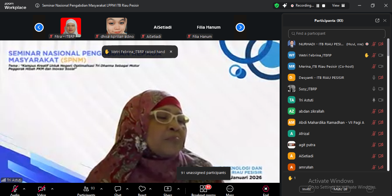 Dumai, 14 Januari 2026 — Lembaga Penelitian dan Pengabdian kepada Masyarakat (LPPM) Institut Teknologi dan Bisnis Riau Pesisir (ITB Riau Pesisir) sukses menyelenggarakan Seminar Nasional Pengabdian kepada Masyarakat (SPNM) secara daring (online) pada Rabu, 14 Januari 2026. Kegiatan ini mengusung semangat penguatan peran perguruan tinggi dalam mendorong inovasi sosial yang berdampak melalui optimalisasi Tri Dharma Perguruan Tinggi.