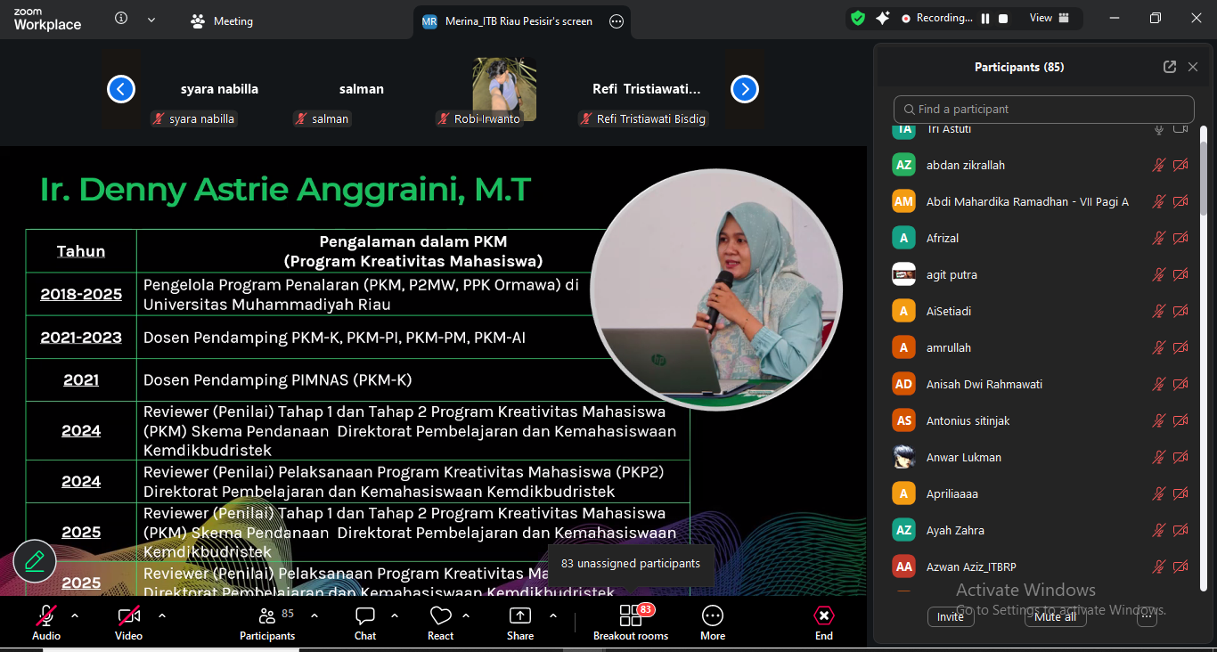 Sementara itu, narasumber kedua, Ir. Denny Astrie Anggraini, M.T. dari Universitas Muhammadiyah Riau, membawakan materi dengan tema:
