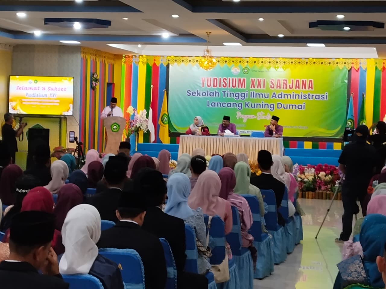 Acara yudisium dipimpin langsung oleh Ketua STIA Lancang Kuning Dumai, Bapak Latip, S.Sos., M.Si., Ph.D., serta dihadiri oleh jajaran pimpinan institusi, para ketua program studi, dosen, dan tenaga kependidikan. Prosesi berlangsung tertib dan penuh khidmat, diawali dengan pembacaan Surat Keputusan Yudisium, penetapan kelulusan mahasiswa, serta penandatanganan berita acara yudisium.