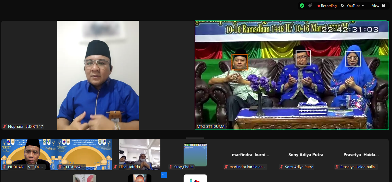 Dumai, Minggu 16 Maret 2025 - Kampus STT Dumai sukses menggelar penutupan Lomba Tilawah Qur'an tingkat mahasiswa se-Provinsi Riau dan Kepulauan Riau (Kepri) dalam rangka menyambut bulan suci Ramadhan 1446 H. Acara ini ditutup secara hybrid, menggabungkan konsep online dan offline, serta dilakukan secara virtual oleh Kepala LLDIKTI XVII RIAU KEPRI, Dr. H. Nopriadi, SKM, M.Kes.