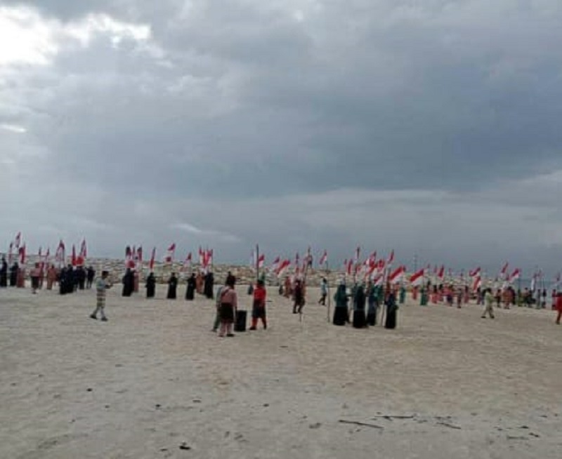 Pengibaran Bendera Merah Putih di Pantai Ketapang Desa Sungai Cingam Rupat.