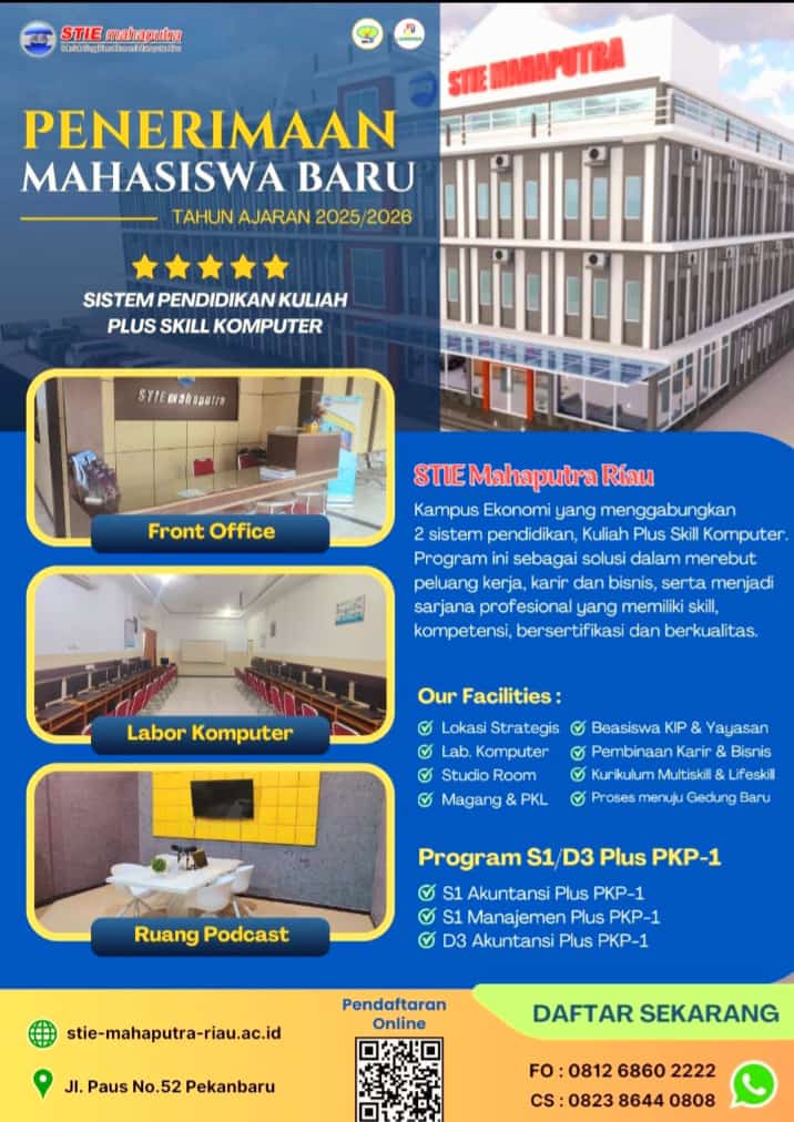 Sekolah Tinggi Ilmu Ekonomi (STIE) Mahaputra Riau secara resmi membuka penerimaan mahasiswa baru untuk Tahun Ajaran 2025/2026. Kampus yang dikenal sebagai institusi pendidikan ekonomi ini menghadirkan sistem pendidikan inovatif, yaitu Kuliah Plus Skill Komputer, yang memberikan kombinasi antara pendidikan akademik dan keahlian komputer bagi mahasiswanya.