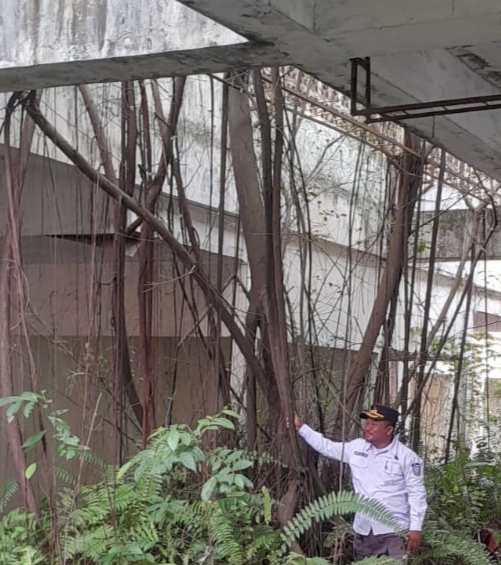 Dalam pemeriksaan tersebut ditemukan bahwa sebagian area lantai atas telah ditumbuhi tumbuhan liar, termasuk akar pohon beringin yang merambat dan berpotensi mengganggu struktur bangunan. Situasi ini menjadi perhatian serius untuk ditindaklanjuti.