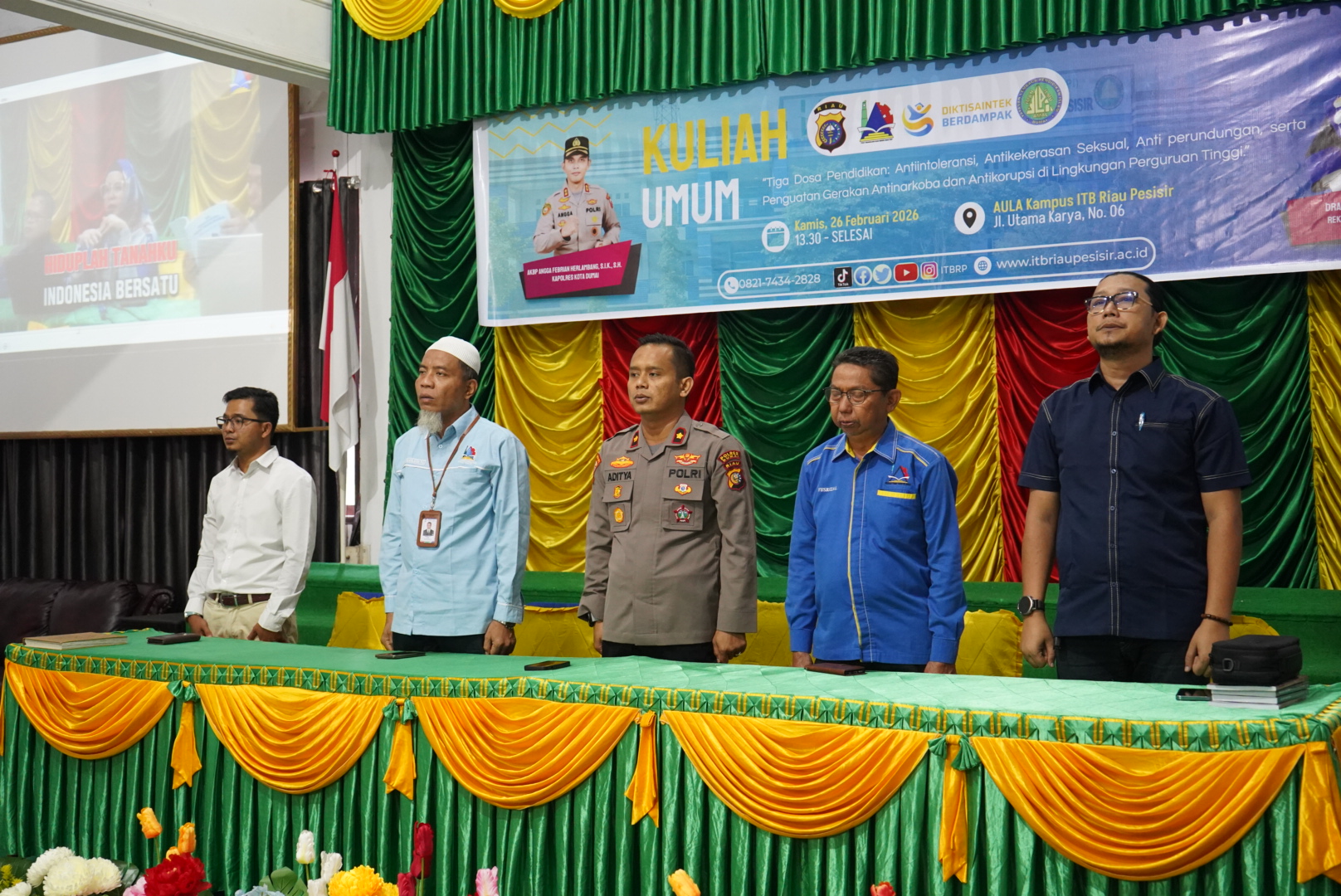 Dumai, 26-02-2026. - ITB Riau Pesisir kembali menegaskan komitmennya dalam membangun budaya akademik yang bersih dan berintegritas melalui Kuliah Umum bertema “Tiga Dosa Pendidikan: Antiintoleransi, Antikekerasan Seksual, Anti Perundungan, serta Penguatan Gerakan Antinarkoba dan Antikorupsi di Lingkungan Perguruan Tinggi” yang digelar Kamis (26/2/2026) di Aula Kampus ITB Riau Pesisir.