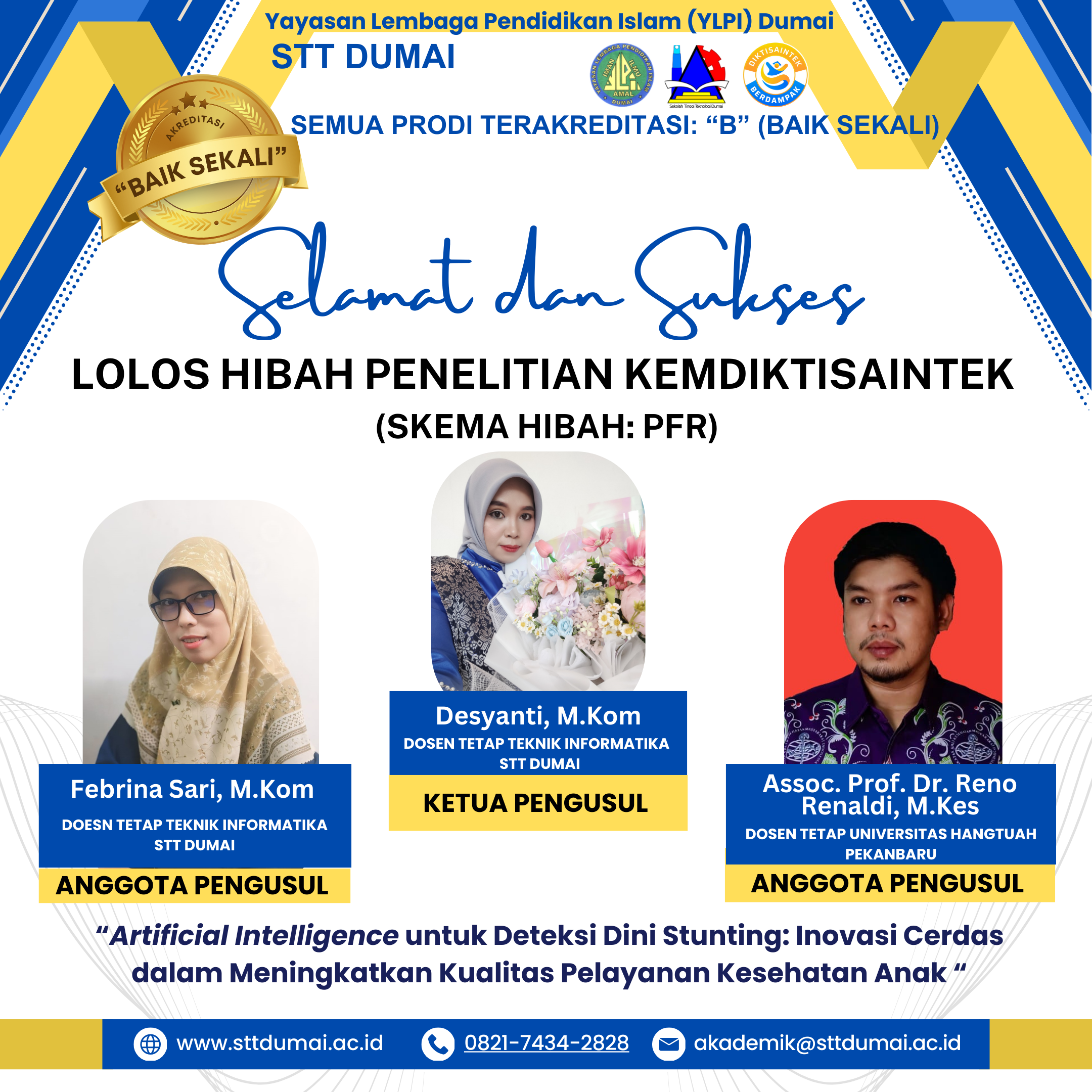 Dumai, 25 Mei 2025 – Dunia pendidikan tinggi di Kota Dumai kembali menorehkan prestasi membanggakan. Kolaborasi antara dosen tetap dari Sekolah Tinggi Teknologi (STT) Dumai dan Universitas Hang Tuah Pekanbaru berhasil meraih hibah bergengsi Penelitian Fundamental Reguler (PFR) yang didanai oleh Kementerian Pendidikan, Kebudayaan, Riset, dan Teknologi (Kemendikbudristek) Republik Indonesia tahun 2025.