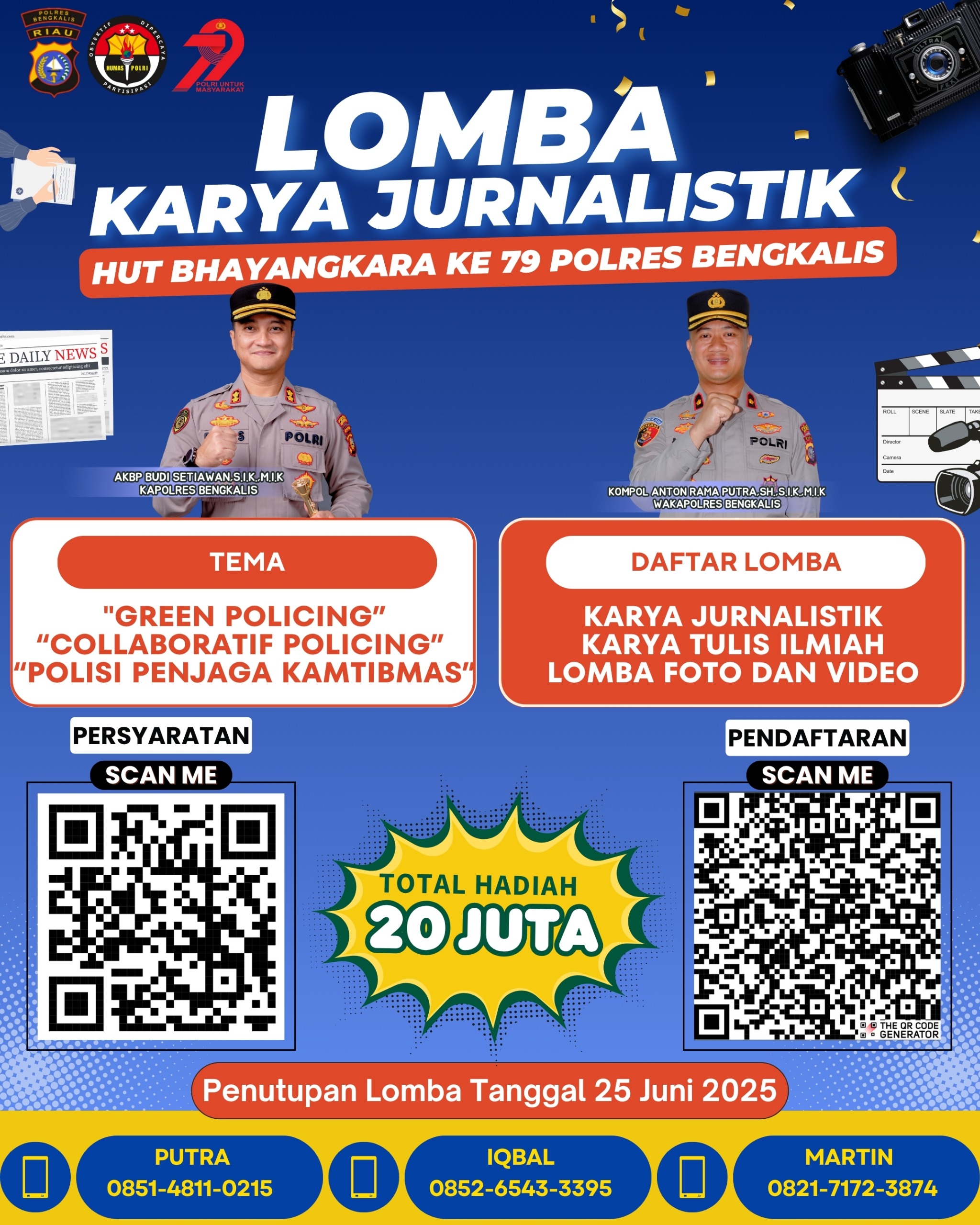 Panitia menetapkan total hadiah sebesar Rp20 juta bagi para pemenang dari masing-masing kategori. Adapun batas akhir pengumpulan karya diperpanjang hingga Rabu, 25 Juni 2025 pukul 00.00 WIB. Pendaftaran dan pengiriman karya dilakukan secara daring melalui tautan QR code yang tersedia di akun Instagram resmi Polres Bengkalis.