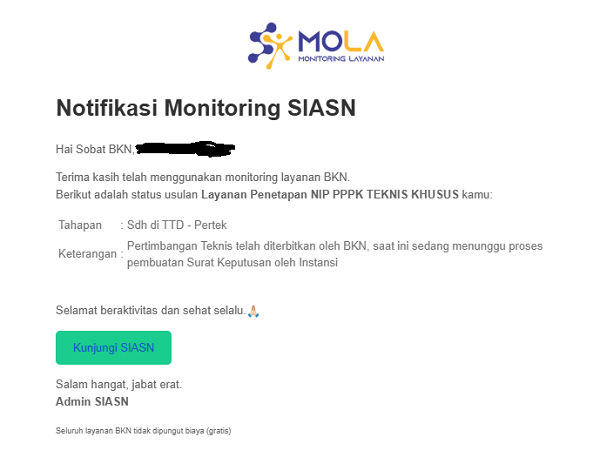 Nah, bagi kalian yang sudah mengecek status di Mola BKN dan mendapatkan notifikasi bahwa proses pertimbangan teknis (pertek) sudah ditandatangani secara digital, selamat ya!