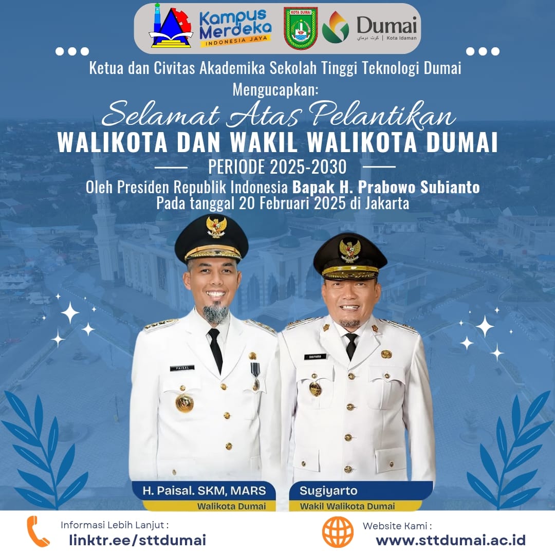 Dumai, 20 Februari 2025 – Ketua dan Civitas Akademika Sekolah Tinggi Teknologi (STT) Dumai dengan penuh kebanggaan mengucapkan selamat atas pelantikan H. Paisal, SKM, MARS sebagai Wali Kota Dumai dan Sugiyarto sebagai Wakil Wali Kota Dumai untuk periode 2025-2030. Pelantikan ini dilakukan langsung oleh Presiden Republik Indonesia, Bapak H. Prabowo Subianto, di Jakarta pada tanggal 20 Februari 2025.