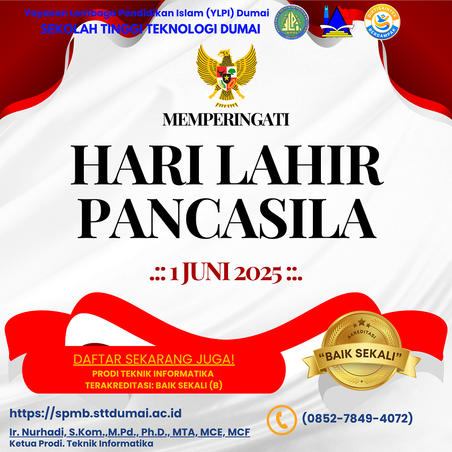 DUMAI – Sabtu, 01 Juni 2025. Dalam semangat memperingati Hari Lahir Pancasila yang jatuh pada tanggal 1 Juni 2025, Sekolah Tinggi Teknologi (STT) Dumai menyampaikan ucapan Selamat Hari Lahir Pancasila kepada seluruh masyarakat Indonesia. Melalui program studi unggulannya—Teknik Informatika, Teknik Sipil, dan Teknik Industri, STT Dumai meneguhkan komitmennya dalam membumikan nilai-nilai Pancasila di dunia pendidikan tinggi.