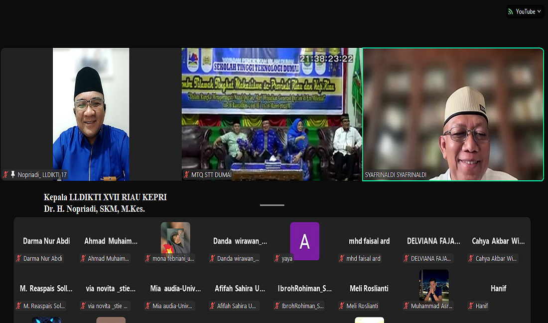 Dumai, Minggu 16 Maret 2025 - Kampus STT Dumai sukses menggelar penutupan Lomba Tilawah Qur'an tingkat mahasiswa se-Provinsi Riau dan Kepulauan Riau (Kepri) dalam rangka menyambut bulan suci Ramadhan 1446 H. Acara ini ditutup secara hybrid, menggabungkan konsep online dan offline, serta dilakukan secara virtual oleh Kepala LLDIKTI XVII RIAU KEPRI, Dr. H. Nopriadi, SKM, M.Kes.