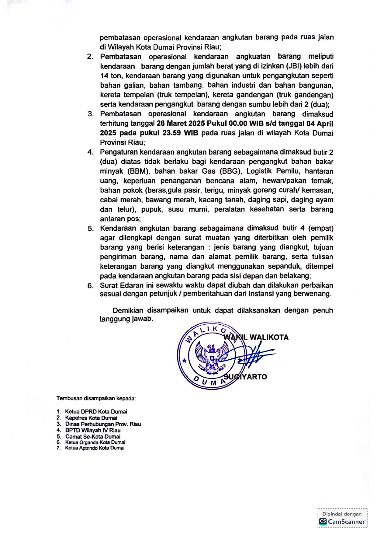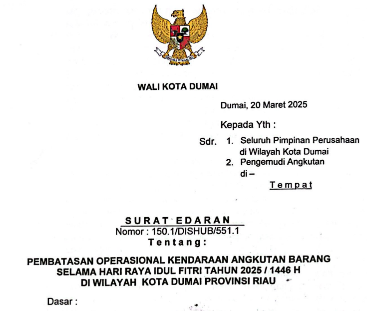 Wali Kota Dumai Terbitkan Surat Edaran Pembatasan Operasional Kendaraan Angkutan Barang Selama Lebaran 2025.