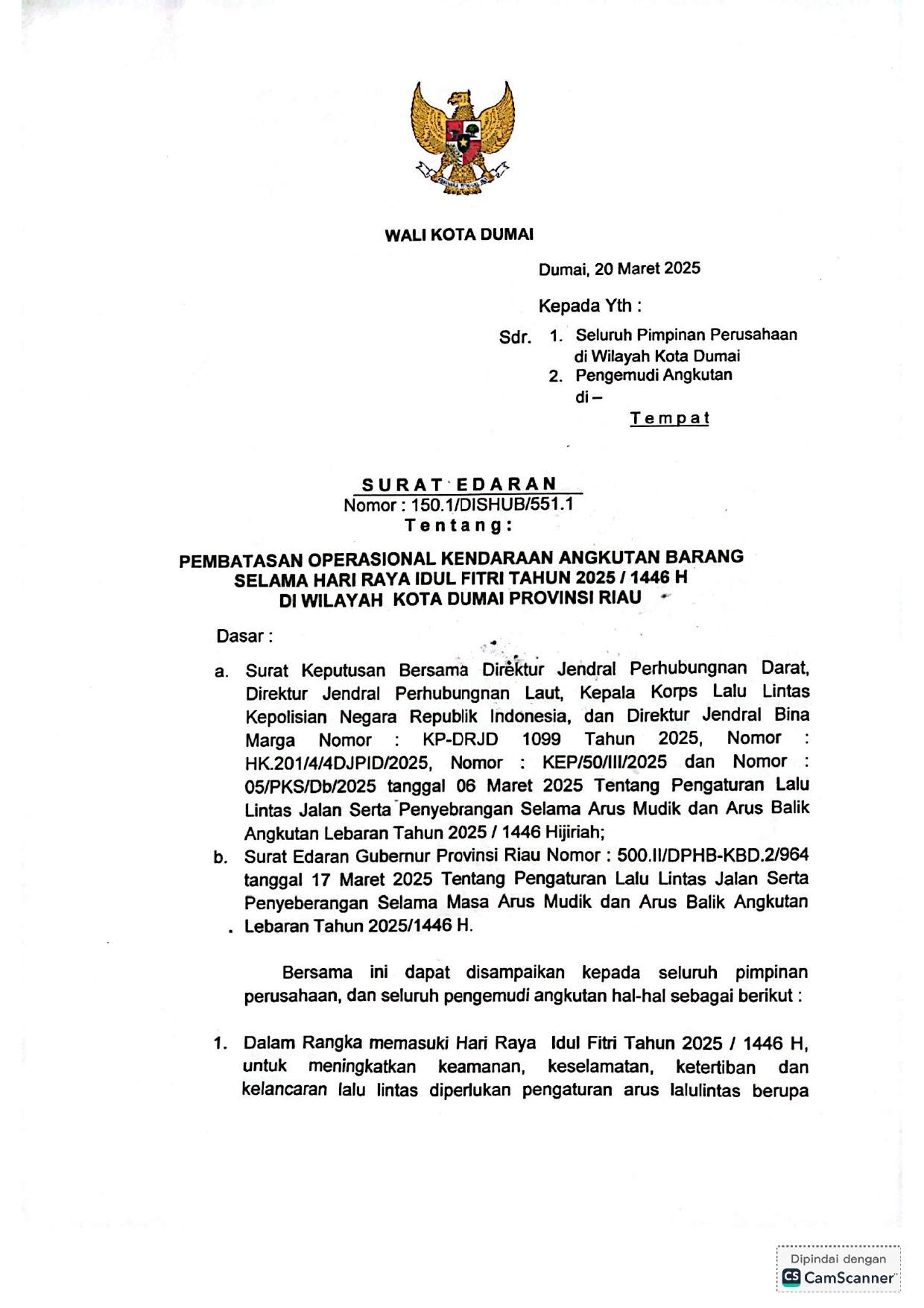Dumai, 26 Maret 2025 – Pemerintah Kota Dumai secara resmi memberlakukan pembatasan operasional kendaraan angkutan barang selama periode arus mudik dan balik Lebaran 1446 H. Kebijakan ini tertuang dalam Surat Edaran Nomor 150.1/DISHUB/551.1 yang ditandatangani Wakil Walikota Dumai (SUGIYARTO).