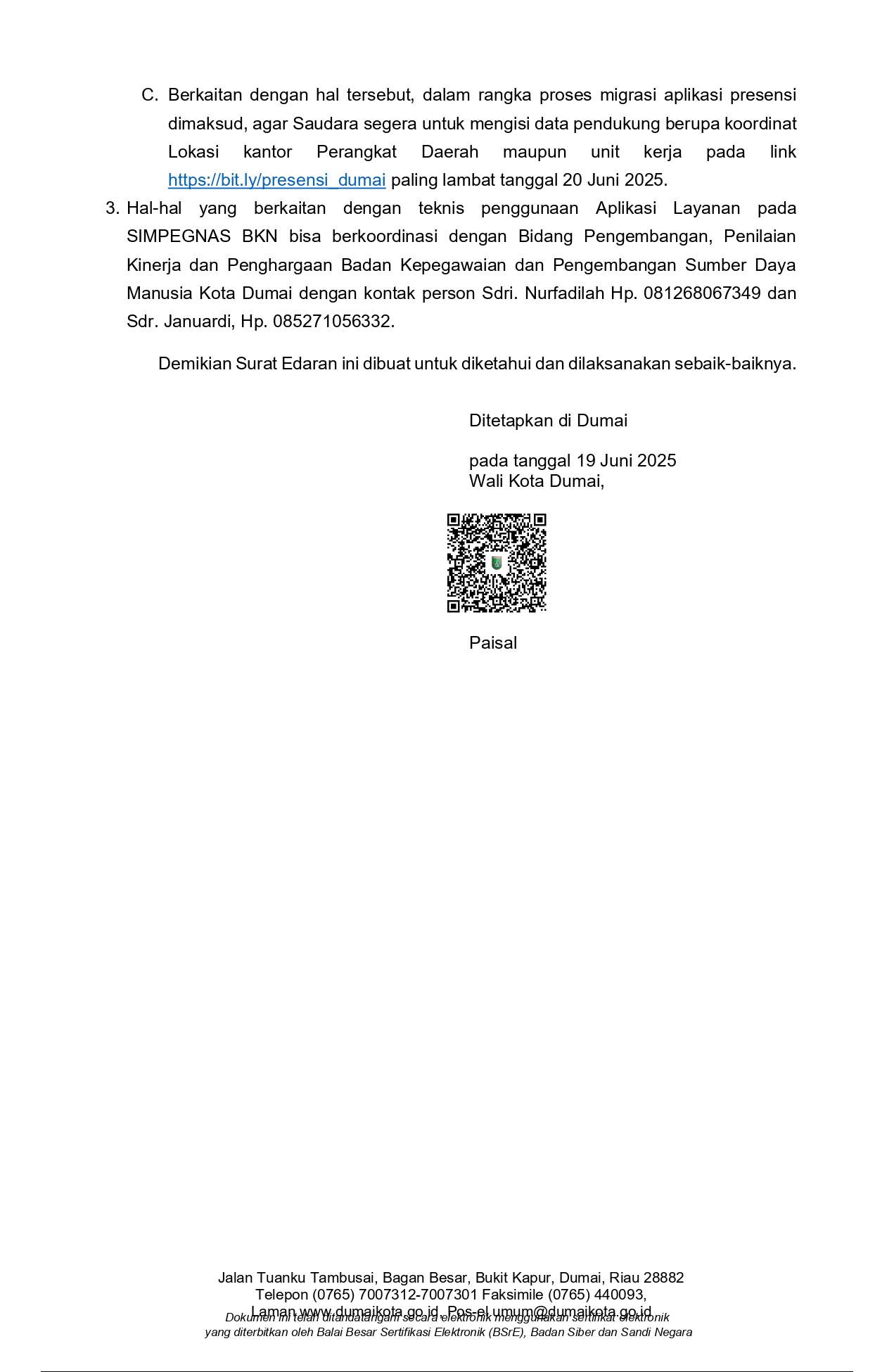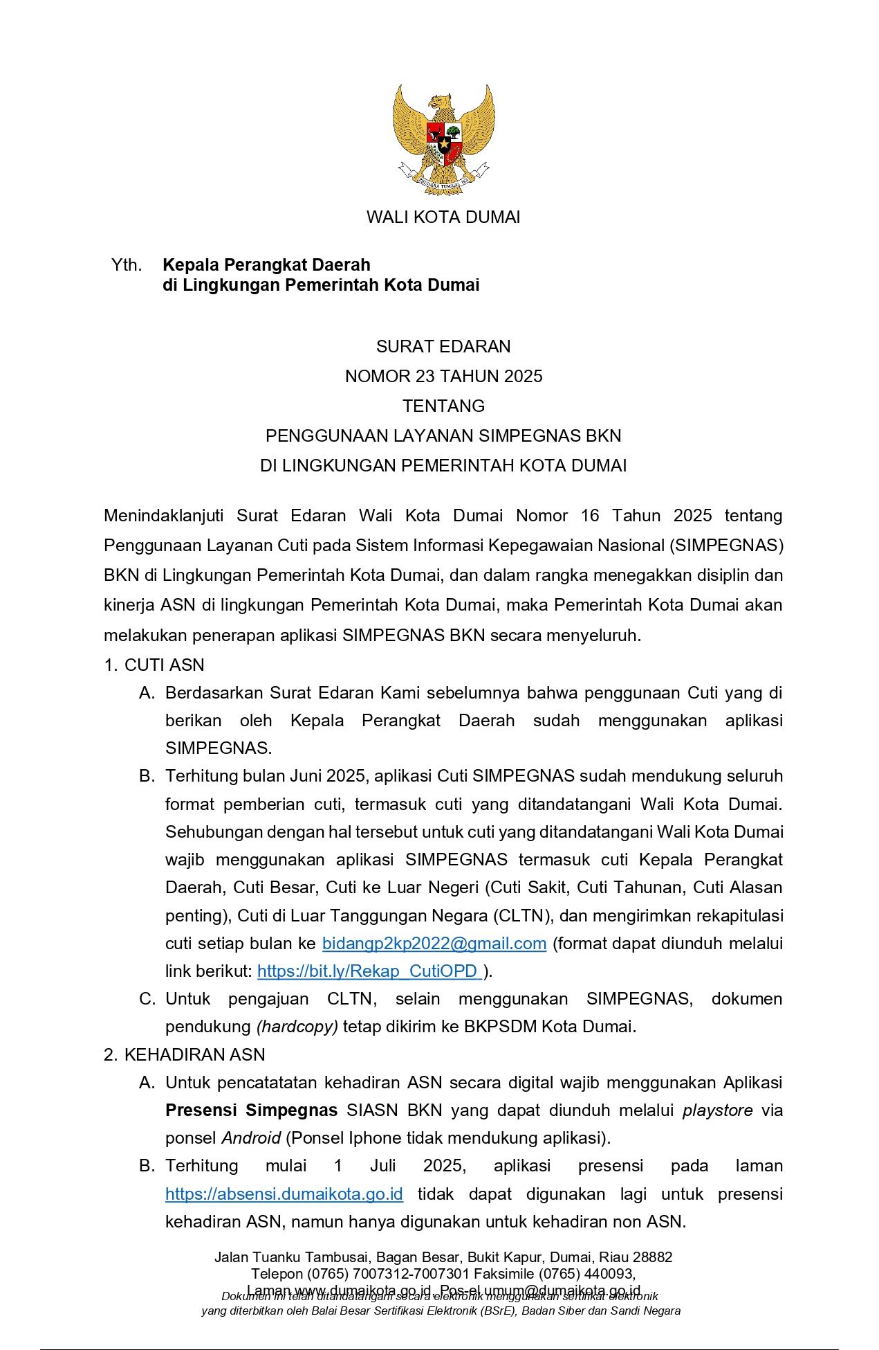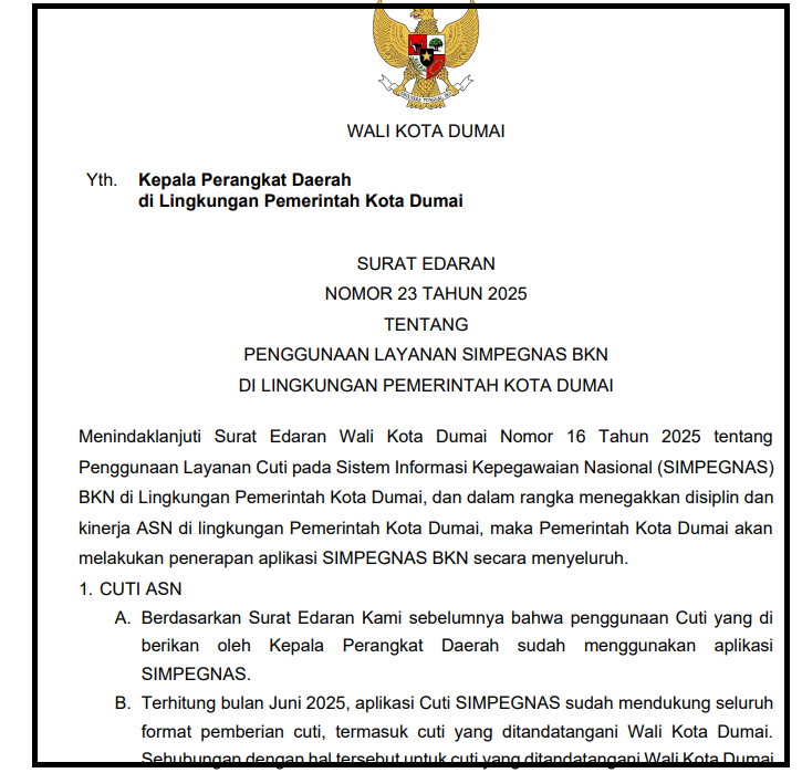 Kebijakan ini tertuang dalam Surat Edaran Wali Kota Dumai Nomor 23 Tahun 2025 tentang Penggunaan Layanan SIMPEGNAS BKN, yang ditandatangani langsung oleh Wali Kota Dumai, Paisal, pada 19 Juni 2025.